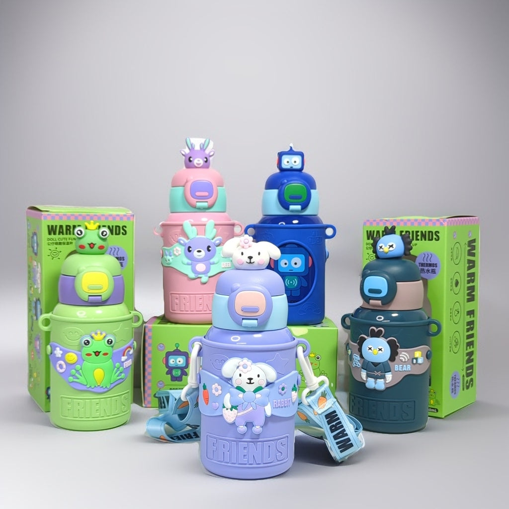 HOMIQUE Warm Friends Cute Animal Thermos Bottle – Insulated Kids Water Bottle with Strap (450ml)