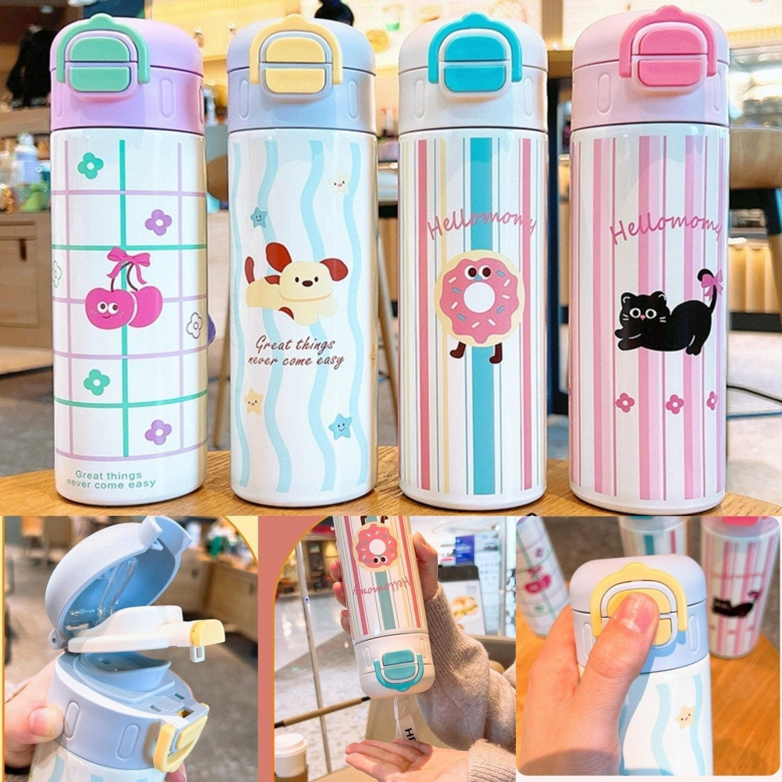 DESIGN: Adorable cartoon-themed insulated travel mug featuring cute characters and a comfortable plastic handle for...