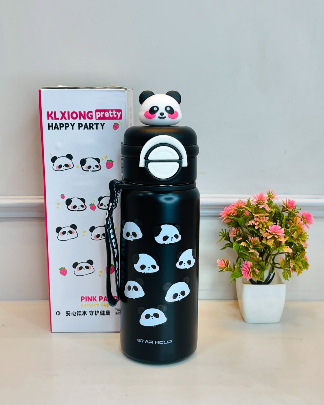 Insulated Panda Water Bottle β Keeps drinks hot or cold for hours! Features cute panda prints and a secure, leak-proof lid with a strap for easy carrying.